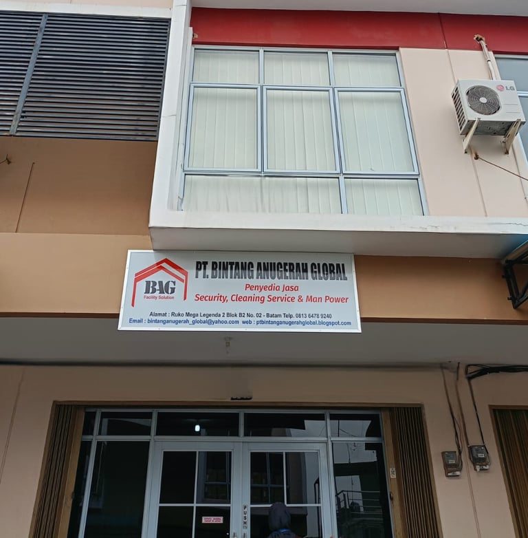 PT. Bintang Anugerah Global (BAG) adalah perusahaan Multi-Service yang berdiri pada tahun 2013 yang berpusat di Ruko Mega Legenda 2 B2. No.2 Kel. Baloi Permai Kec. Batam Kota. Kepulauan Riau. Sebuah perusahaan yang bergerak dibidang usaha jasa pemeliharaan Kebersihan, meliputi pembersihan Gedung, Office, Mall, Hospital, Sekolah, dll.